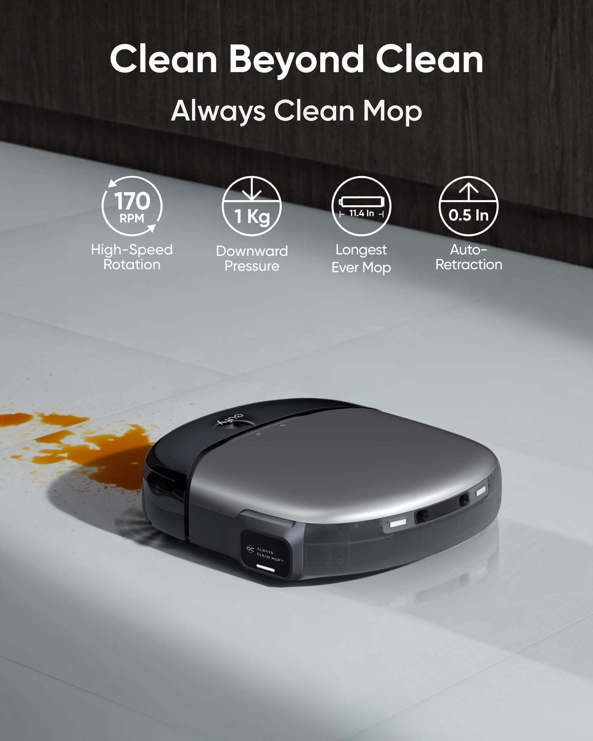 - Always Clean Mop™️: Unveiling a new era in floor care, this revolutionary system boasts an innovative dual water reservoir design. The mop spins at 170 RPM, is continuously cleaned and rinsed by the mix of clean water and detergent, redefining the essence of pristine floors. Emulating human hands scrubbing, it exerts 1 kg (2.2 lb) of pressure, eradicating even the most difficult stains. Spanning 290 mm (11.4 in.), it sweeps across large area, leaving behind nothing.