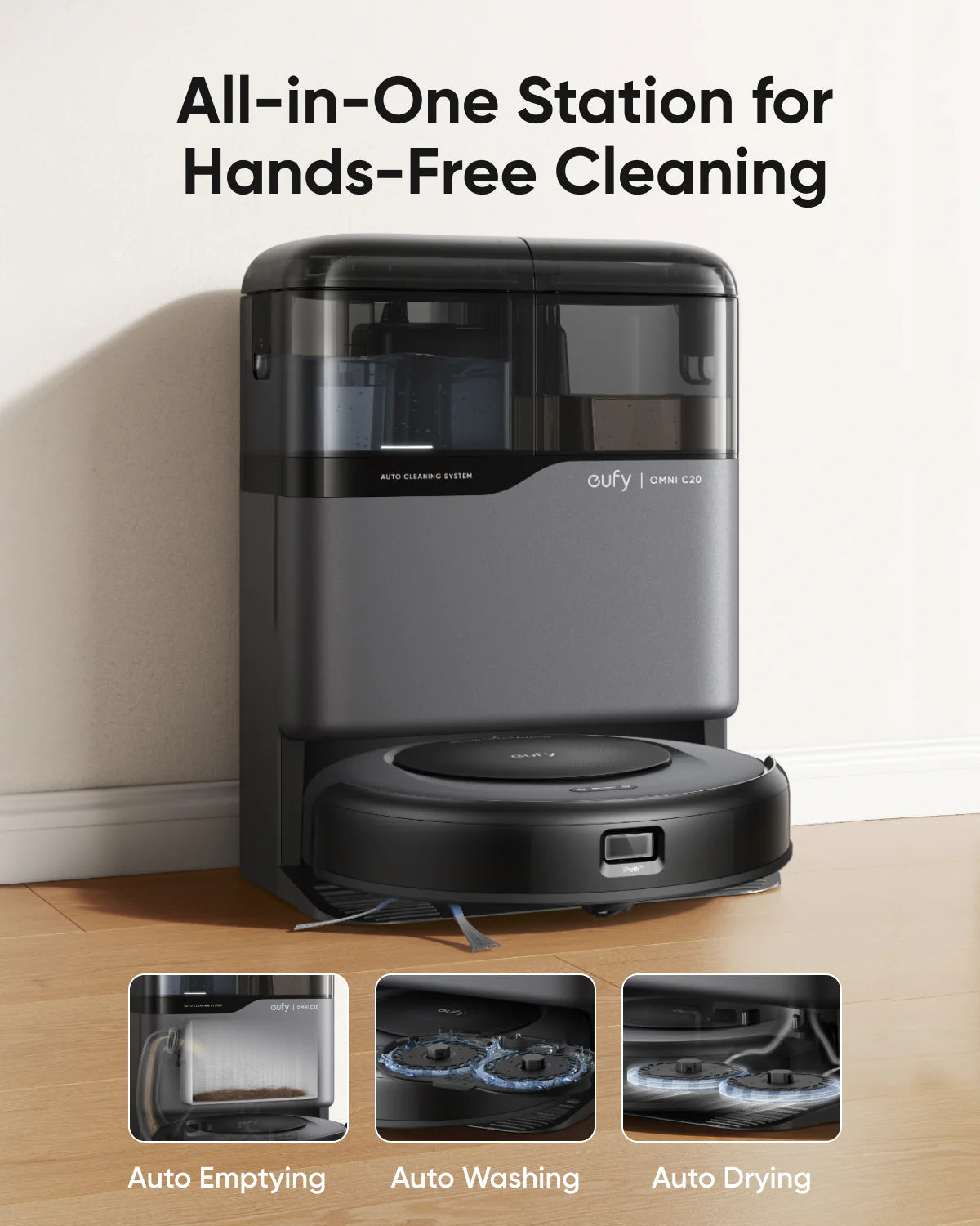 All-in-One Station: eufy Robot Vacuum Omni C20 offers fully automated cleaning with features like auto emptying, washing, drying, and water refilling. The station dries the mop with room-temperature air and has transparent water tanks, allowing you to easily monitor water levels without opening them. This hands-free system ensures effortless maintenance.