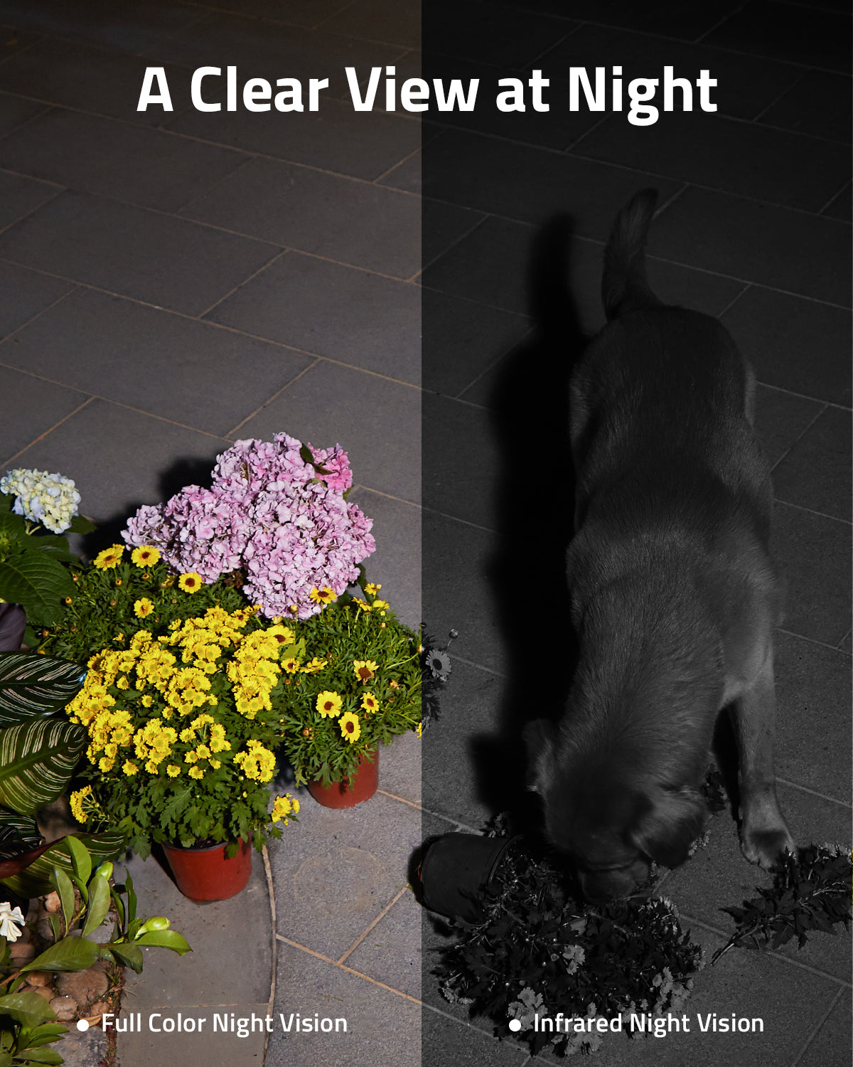 - Light Up the Night: The ultra-bright 600 Lumens spotlight switches on as soon as motion is detected, shining a light on any unwanted guests, while the color night vision picks out details in the darkness up to 8 meters away.