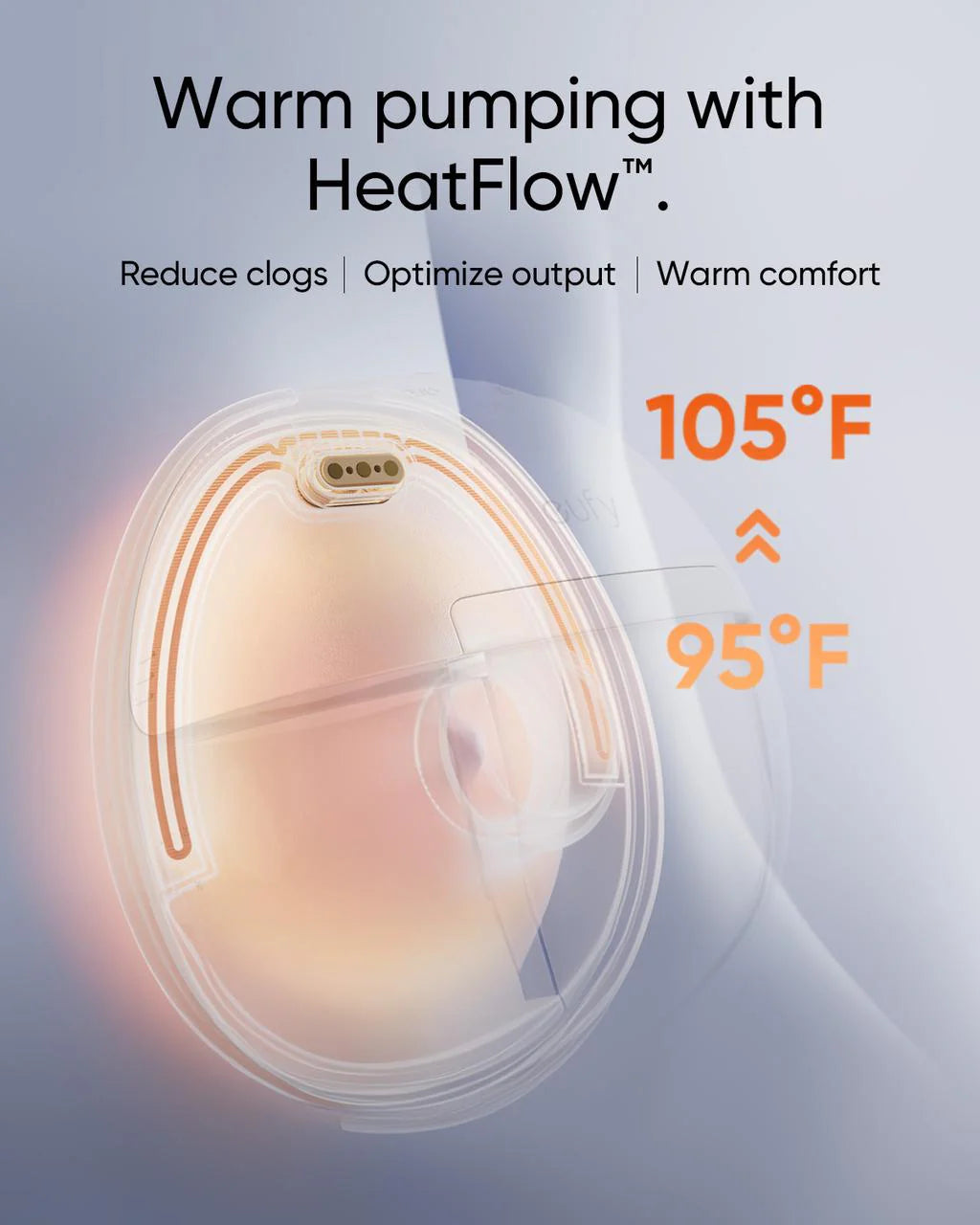 - The Only Wearable Breast Pump With Heating:Featuring a built-in heating and precision temperature sensor, our Heatflow technology delivers uniform heat through the soft silicone for comforting warmth. 7 adjustable heat settings (95°F to 105°F) enhance milk flow and reduce clogs, offering a skin-like pumping experience.